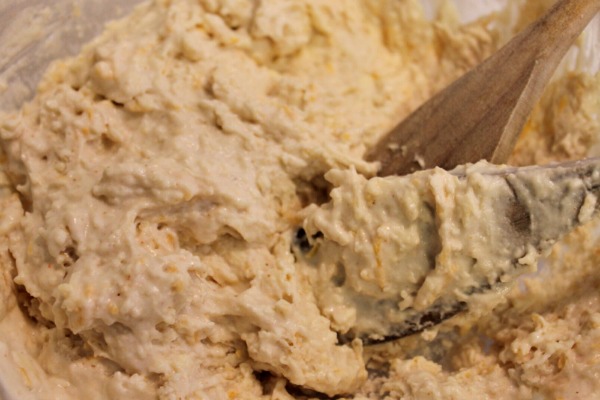 Add in the cheese, sour cream, and milk and stir until the dry ingredient are wet. Leave some lumps!